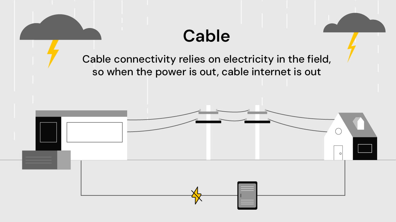 Cable internet providers rely on electrical power to operate key components between the Central Office and homes and businesses. Since the electrical component is integral to cable/coax connectivity, when the power goes out, the cable goes out, regardless of power backup at the source or at home.